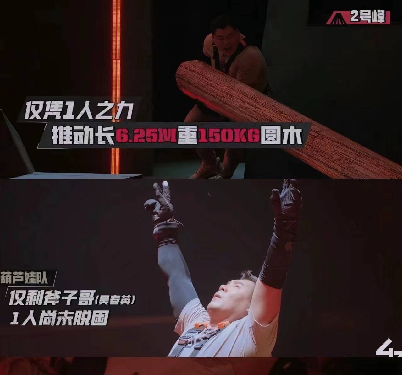 陈森森在被拉拽过程中,手臂被缠绕,拉出一圈血红印子;留到最后的刘丽、斧子哥在四处都是岩浆的情况下,用木头搭建桥梁;最后上方的队员大家一起拉拽梯子,依靠集体的力量,在最后一秒钟将老大哥斧子哥拉了上来,实现了全员成功脱险。