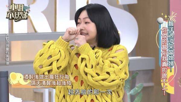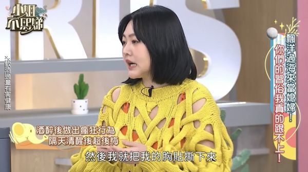 直到第二天清醒过来,小S才恍然大悟,婆婆将她的胸贴用卫生纸包好还给她。她打开卫生纸后惊呼,而婆婆也尴尬地不知道该说什么,小S回想起来只能苦笑:“超丢脸的那一次,超尴尬!”