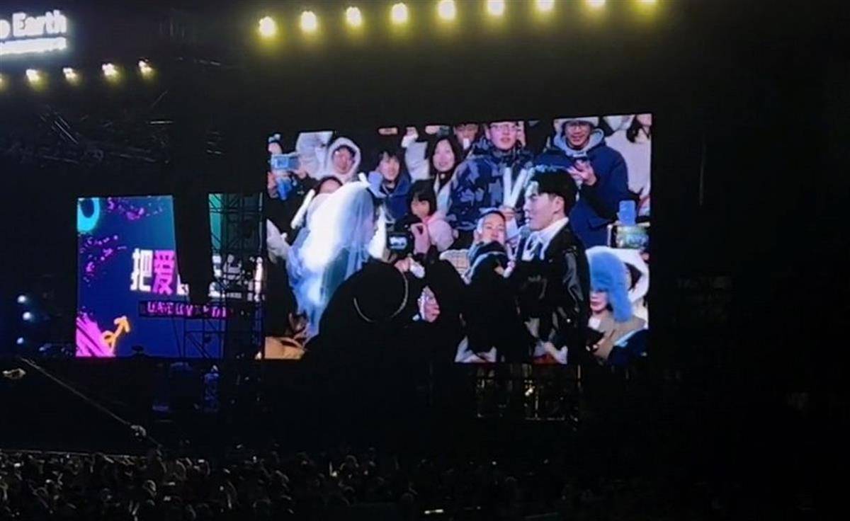 多段视频显示,在演唱会现场,男子拿起话筒,对头顶白色头纱的女子说:“想在现场这么多人的见证下,再一次地向你求婚。”现场的电子屏幕上,写有“大胆表白你的爱”几个大字。就在男子求婚时,距离较远的观众,却齐喊“退票”。