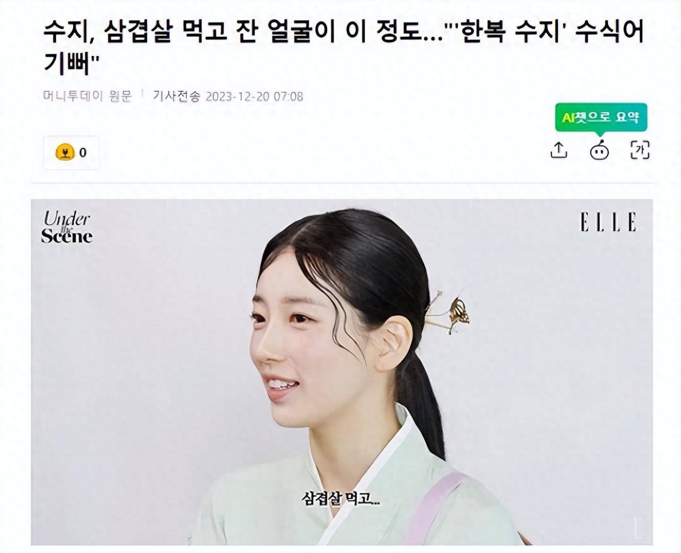 12月20日,有韩国媒体报道,19日,时尚杂志《Elle》YouTube发文称:“秀智在拍摄前一天所做的就是吃五花肉” ,发布了题为“秀智全程穿着传统服装的珍贵视频”的视频。