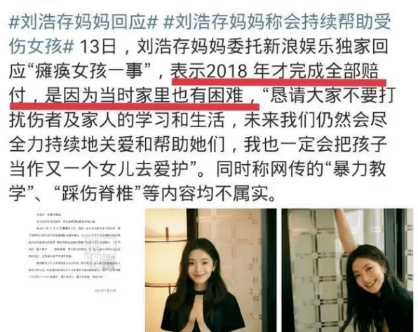 这件事被扒出来后,刘浩存母亲表示是因为当时家庭困难,也已经和小女孩家和解了。而她嘴里的家庭困难,是把钱用在了刘浩存身上。