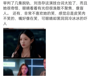 本来《脱轨》里刘浩存的演技就备受质疑,观众表示女主角眼神不聚焦,就像盲人一样。明明嘴巴在笑,眼神却空洞给人冷冰冰的感觉。