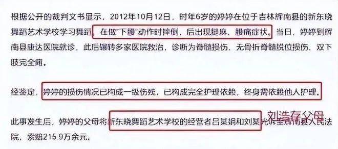 在2012年时刘浩存母亲创办的舞蹈学院,因为舞蹈班错误的教学办法,让一个小女孩下腰时摔倒,被诊断为脊髓损伤、无骨折脊髓脱位损伤,导致下肢瘫痪,终身残疾。