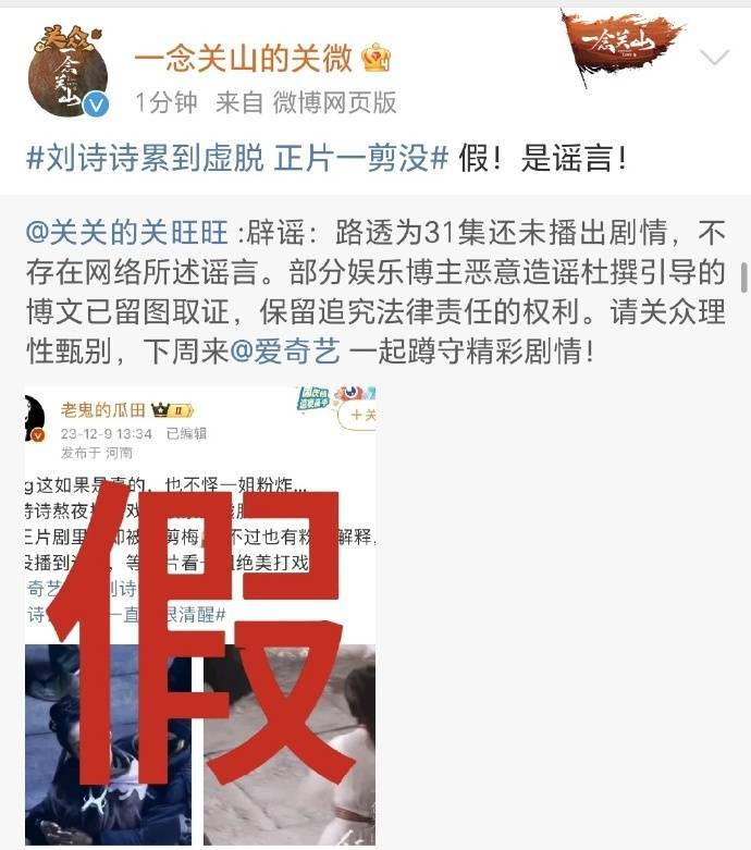 搜狐娱乐讯 12月10日,刘诗诗新剧官方发文,回应了网传的刘诗诗路透涉及情节被剪掉一事,表示为谣言,其情节为剧集的31集涉及内容,只是暂未播出。