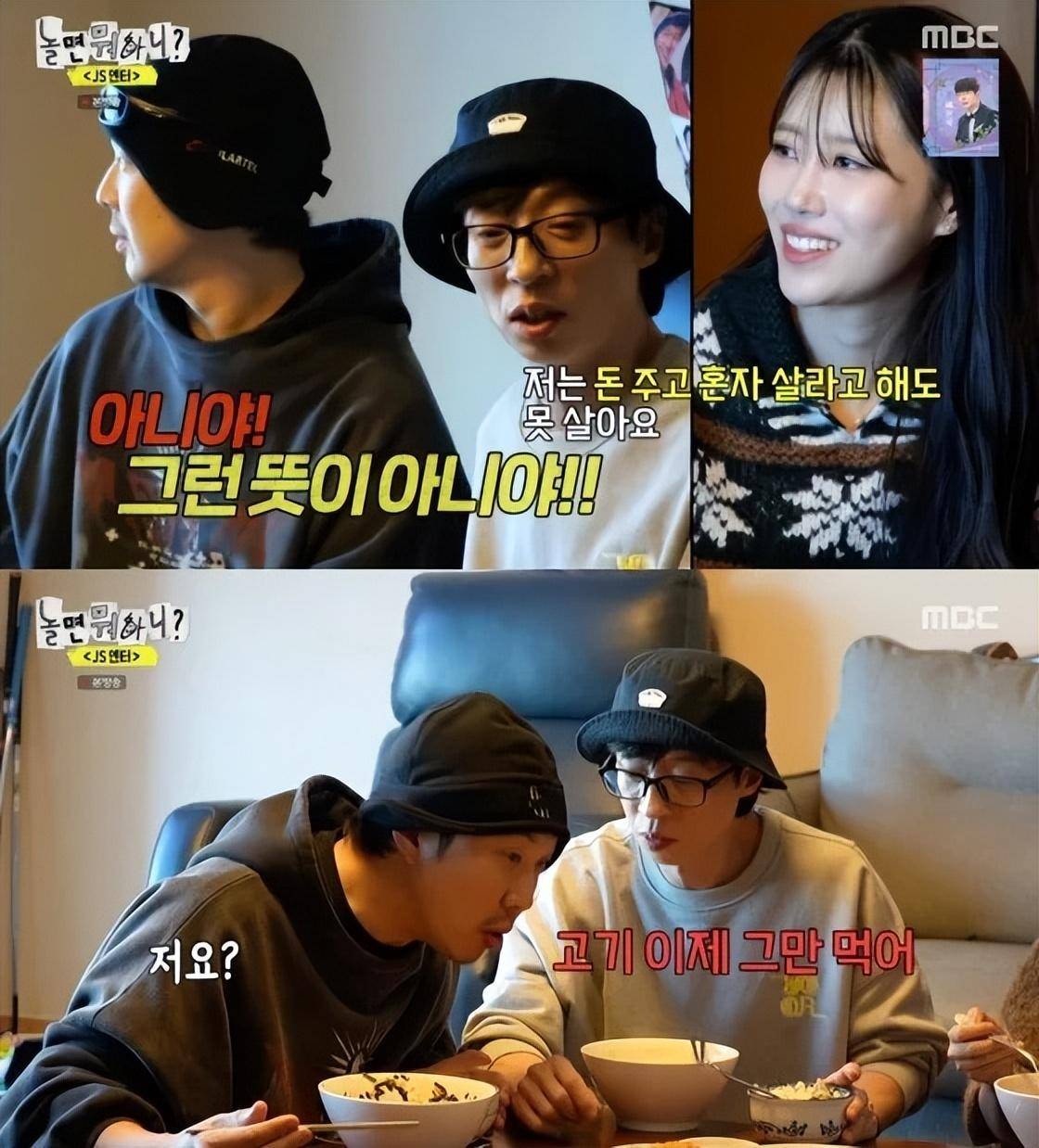 李美珠一针见血地说道:“现在想一个人住吗?”,刘在石摆摆手,否认了她的话说:“就算你付钱给我,我也不能一个人住”,“一个人住的时候很孤独,有家人的时候很温暖”,哈哈甚至也喊出了与刘在石的口号。