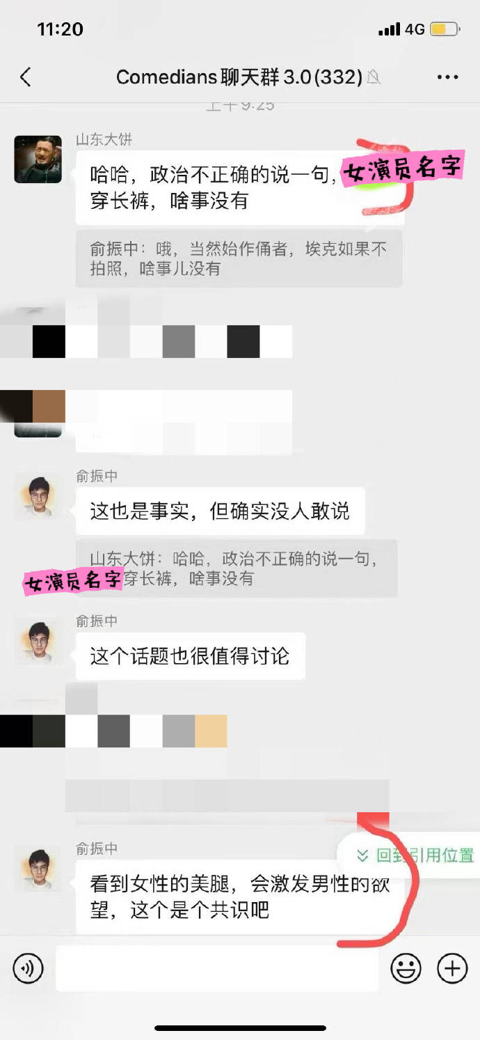 搜狐娱乐讯 近日 有脱口秀演员爆料,上海魔脱的男演员埃克偷拍女演员穿短裤照片,还与其他男演员在群里作出侮辱性评价。据悉,群里参与讨论的男演员还有俞振中、山东大饼。