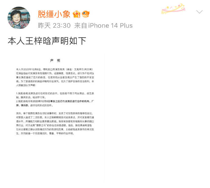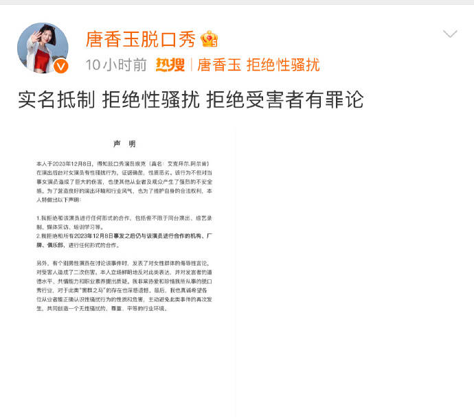 目前,唐香玉等多位女演员联合发声明抵制性骚扰,表示拒绝与埃克及其俱乐部合作。