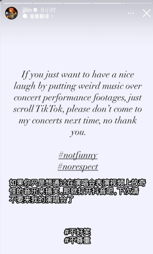 就在网友们差点笑吐了的时候,结果林俊杰本人不满意了,在外网发文:“如果你只是想通过在表演片段上加上奇怪的音乐来获得快乐,下次请不要来我的演唱会,不好笑、不尊重。”