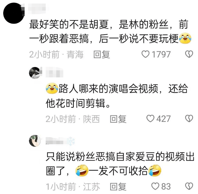 这事儿惹恼网友的还有在中间仰卧起坐的那些粉丝歌迷们,林俊杰生气之前,粉丝的态度是多搞点我爱看这泼天的富贵终于轮到我哥了哈哈哈哈哈哈,林俊杰生气之后,粉丝立马和网友割席开始全网指责乐子路人,甚至上升到网友不尊重音乐。