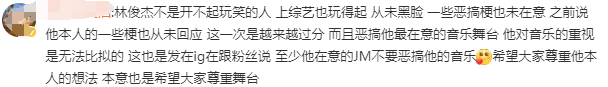 ok,就算像粉丝说的那样,如果林俊杰只是把ins当朋友圈发给自己粉丝看的,粉丝隔着语言上赶着认领都可以,但前脚哈哈哈哈后脚见正主生气就装作无事发生对网友开麦也太有点内个了吧。梗是你先玩的,现在指责别人的也是你。