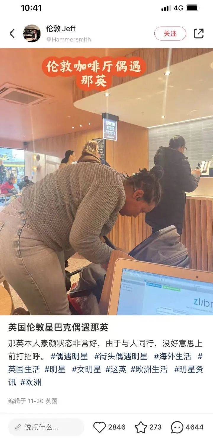 就在大家传得沸沸扬扬的时候,有网友晒出了上个月在英国伦敦的星巴克偶遇那英的照片。