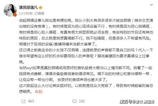 12月6日,演员邵逸凡发文称,“说起假唱这事儿我也是有梗在喉。我从小到大有很多很多次被迫假唱(晚会文艺演出啥的没有商演)。有时候是因为担心现场设备不行,有时候是因为担心我唱砸,有时候是担心别人唱砸,有真有假太明显那就必须全假,有些特别的节目还有其他特别的原因,总之就是我想真唱都不行。”同时她还表示,“这次掀起这么大讨论其实挺好的。以前就是观众太宽容了,导致有时候能省则省总想糊弄。”