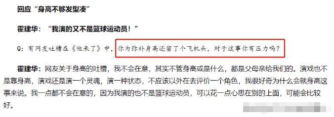霍建华和170cm高的马思纯合作《他来了》时,整了一个看着能增高好几厘米的“飞机头”,面对网友的质疑,霍建华本人也坦然地接受,并表示自己的身高是爸妈给的,只能在别的地方下工夫了。