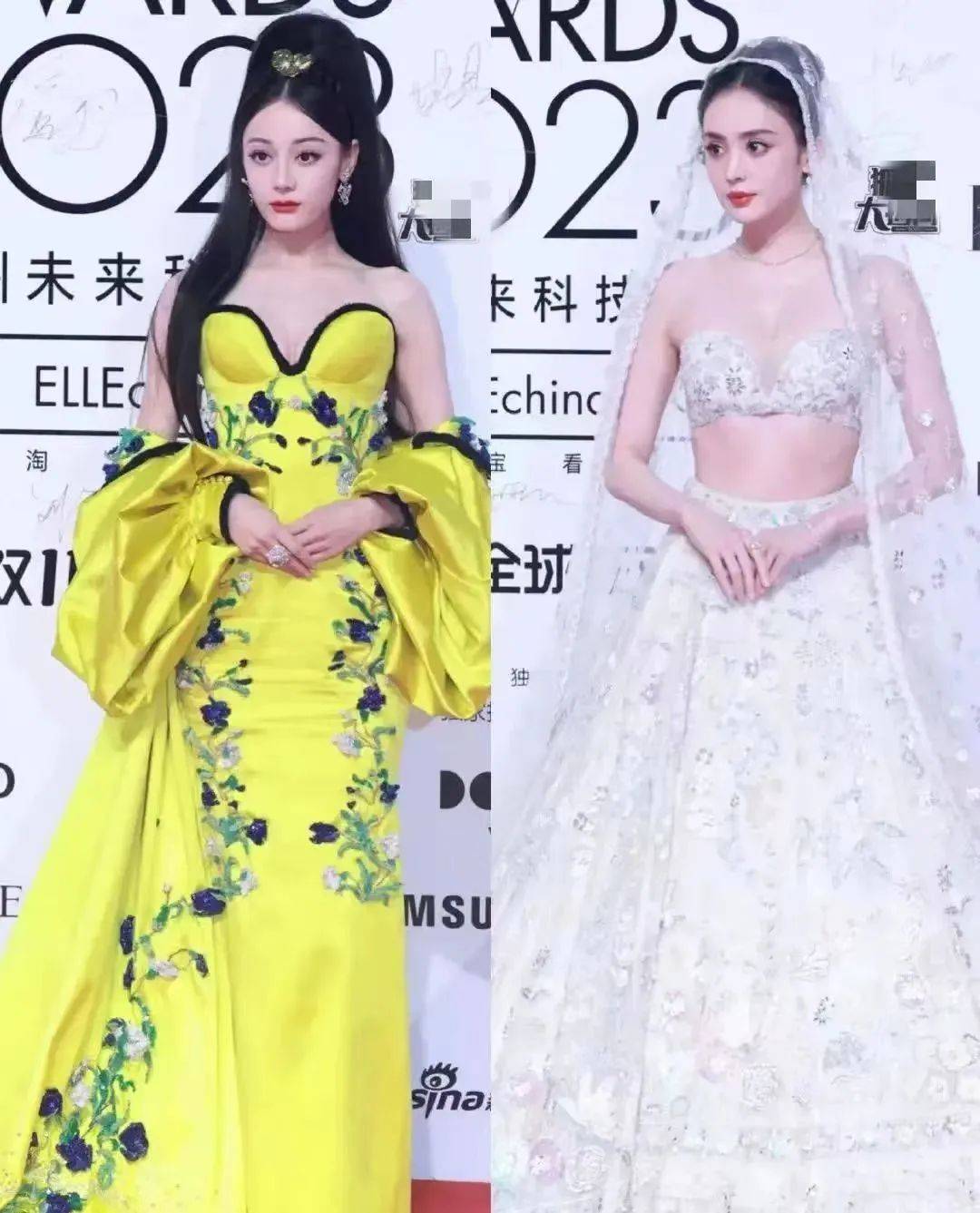 此外,两人都穿了抹胸长裙,依旧是白色和黄色的服装,又被拿来比较。