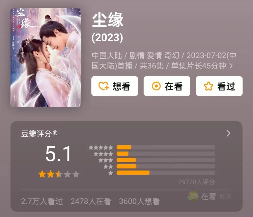 今年,杨颖播了两部新剧,《暮色心约》5.3分,《尘缘》5.1分,两部剧口碑热度都不高,没掀起水花。