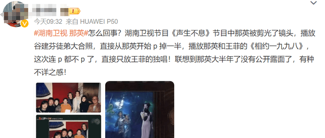 更值得注意的是,节目在播出那英和王菲合唱舞台的时候,只重点播出了王菲的独唱镜头,那英的都被剪掉了,引起网友热议。