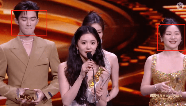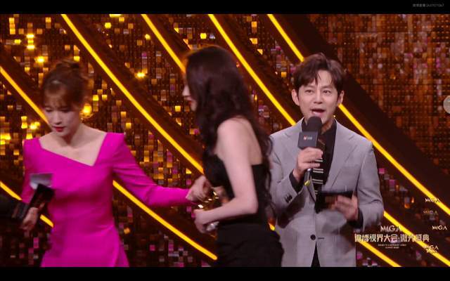 微博的活动一向很会搞话题,这次的许多小游戏环节就很尬,关晓彤刘宇宁上台走秀,关晓彤都绷不住。下台的时候大家从主持人这边离开,直接将何炅的镜头挡得严严实实。