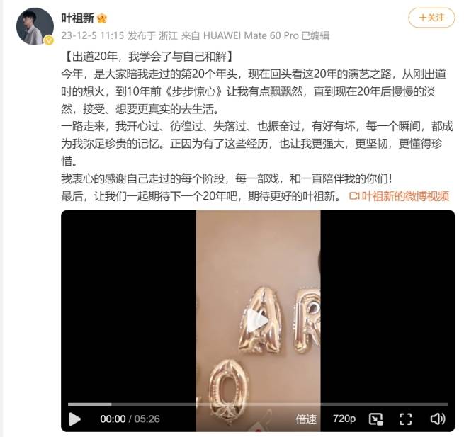 12月5日,实力演员叶祖新在社交平台发布出道20周年活动vlog,并发表短文“出道20年,学会了与自己和解”,感谢一路以来支持的粉丝朋友们。视频中工作人员给叶祖新准备一个惊喜仪式,先后回忆了过往饰演的角色及趣味猜词游戏。