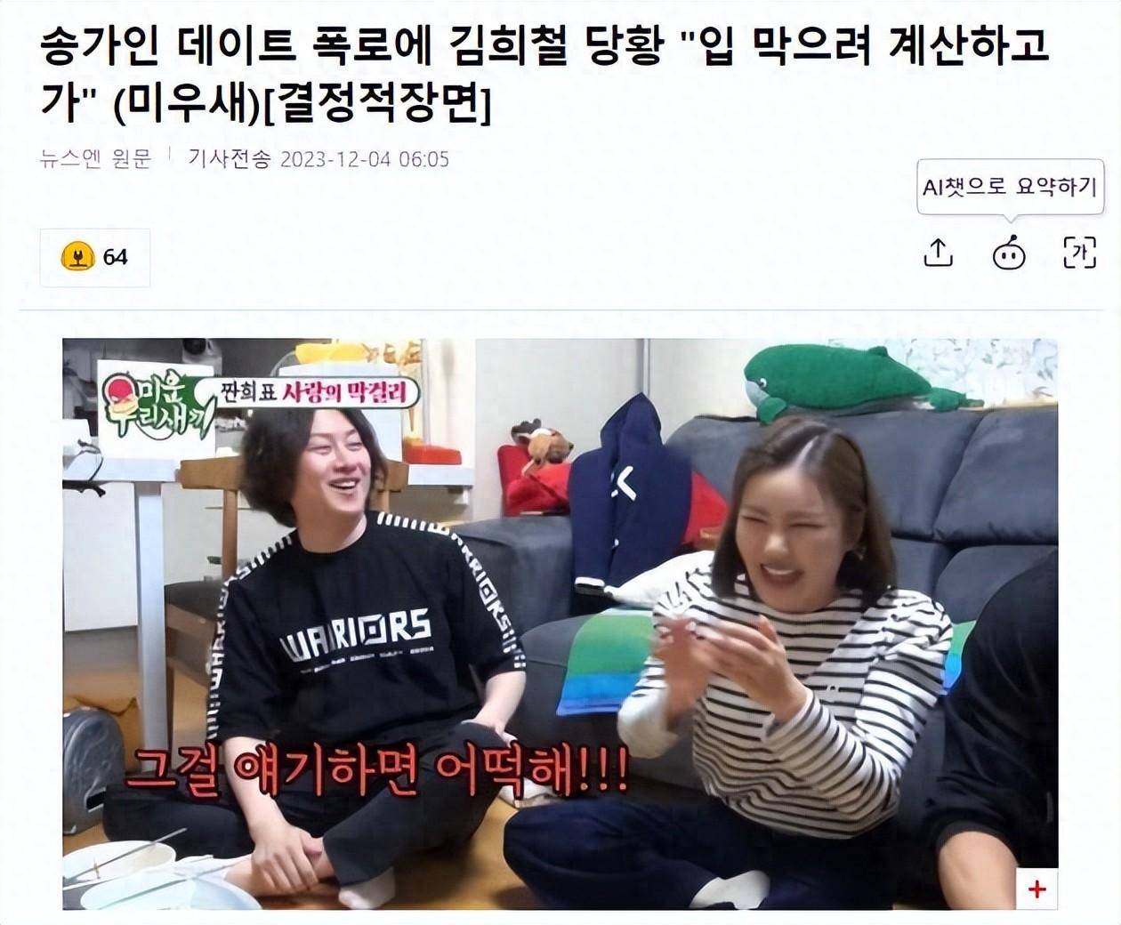 12月4日,有韩国媒体报道,在3日播出的SBS综艺节目《我家的熊孩子》中,宋佳人表示她亲眼目睹了金希澈的约会。