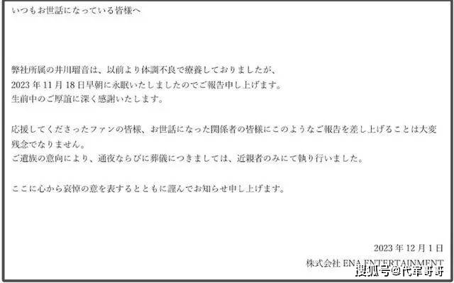 据消息称,井川瑠音大约在今年8月生病,从发病到去世仅2个月,让人震惊又难以接受的感觉,有人说,她可能是因为工作太忙,没有好好照顾自己的身体。