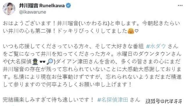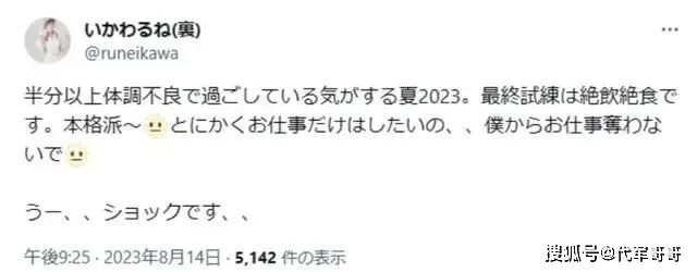 今年夏天,井川瑠音曾抱怨自己经常感觉不舒服,包括容易疲劳,食欲不振,出现中暑的症状,尽管如此,她本人也一直坚持工作,在社交账号上大方分享日常生活。甚至还发文写道:“不管怎样,我只想工作,不要抢走我的工作”,敬业精神令人敬佩。