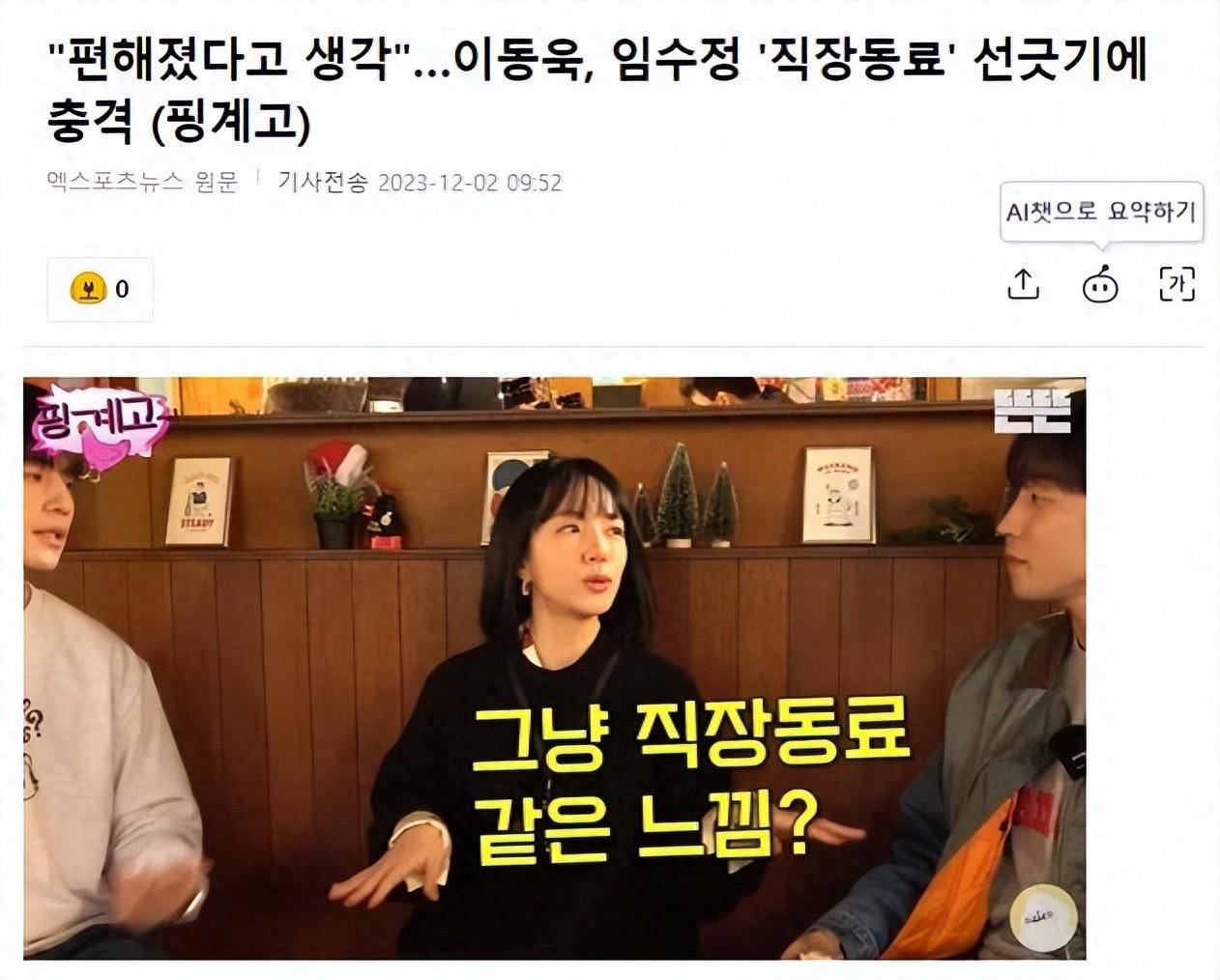 12月2日,有韩国媒体报道,演员李栋旭对林秀晶的“同事”划线感到震惊,2日,《Excuse Go》的新一集在YouTube热门频道上发布。