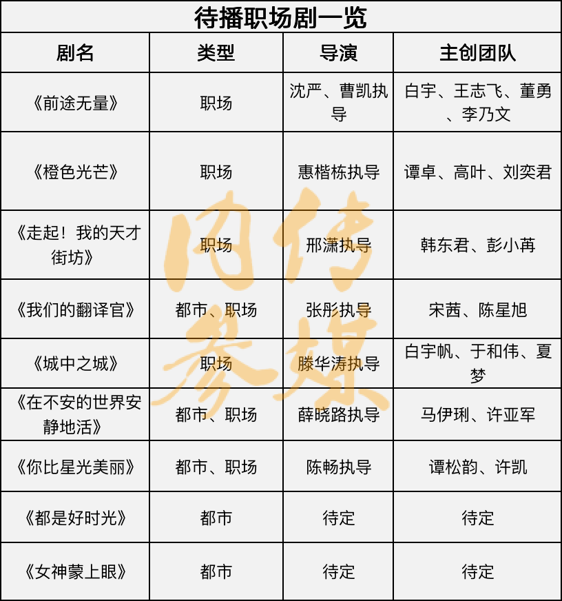 据不完全统计,目前待播的职场剧达9部以上,包括《前途无量》《橙色光芒》《走起!我的天才街坊》《我们的翻译官》《城中之城》《在不安的世界安静地活》《你比星光美丽》《都是好时光》《女神蒙上眼》。