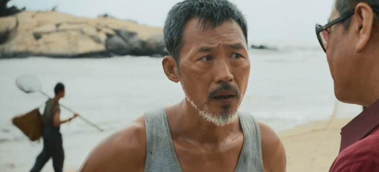 你可以从他的眼神里面看出来他内心的情绪,他瞪着一双眼睛,跟吴老板对峙的时候,完全把打鱼汉子的形象给活灵活现的表现了出来。