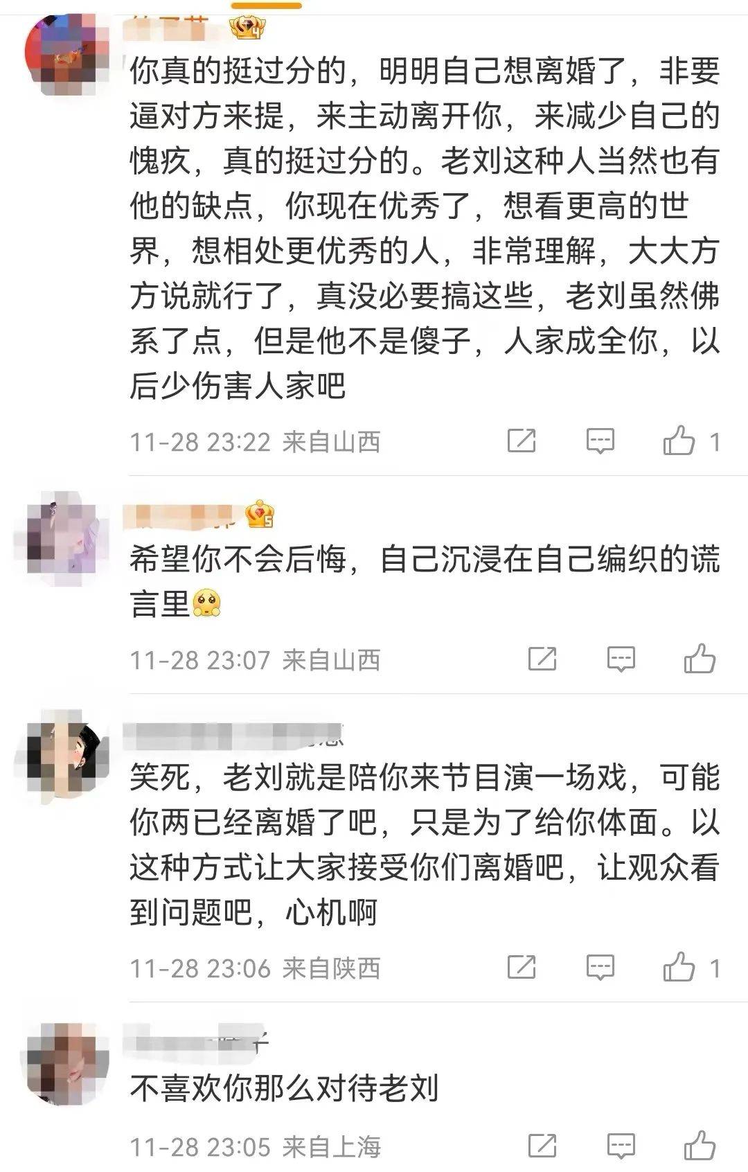 因此节目播出后,傅首尔的评论区彻底沦陷,许多网友觉得她就是自己想离婚,结果还要逼着老刘主动来讲这件事,老刘成为了她在大众面前维持体面的一个工具人。