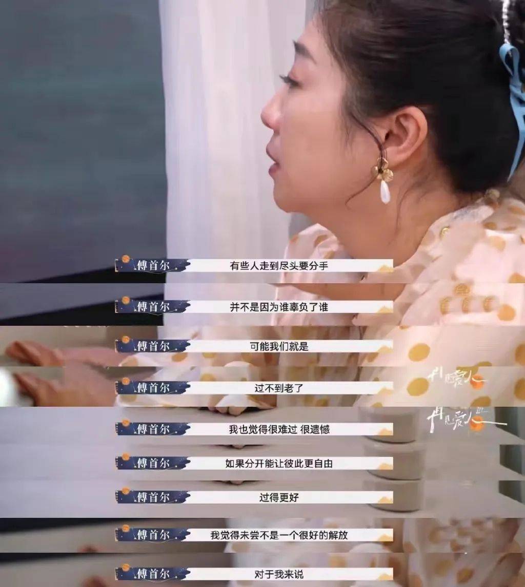 傅首尔饱含热泪地表示,他们之间没有谁辜负了谁,只是不能一起过到老了,虽然选择分开她也感到非常遗憾,但是离开这一选择对她来说更是一种解脱,有一种释然的成分在里面。