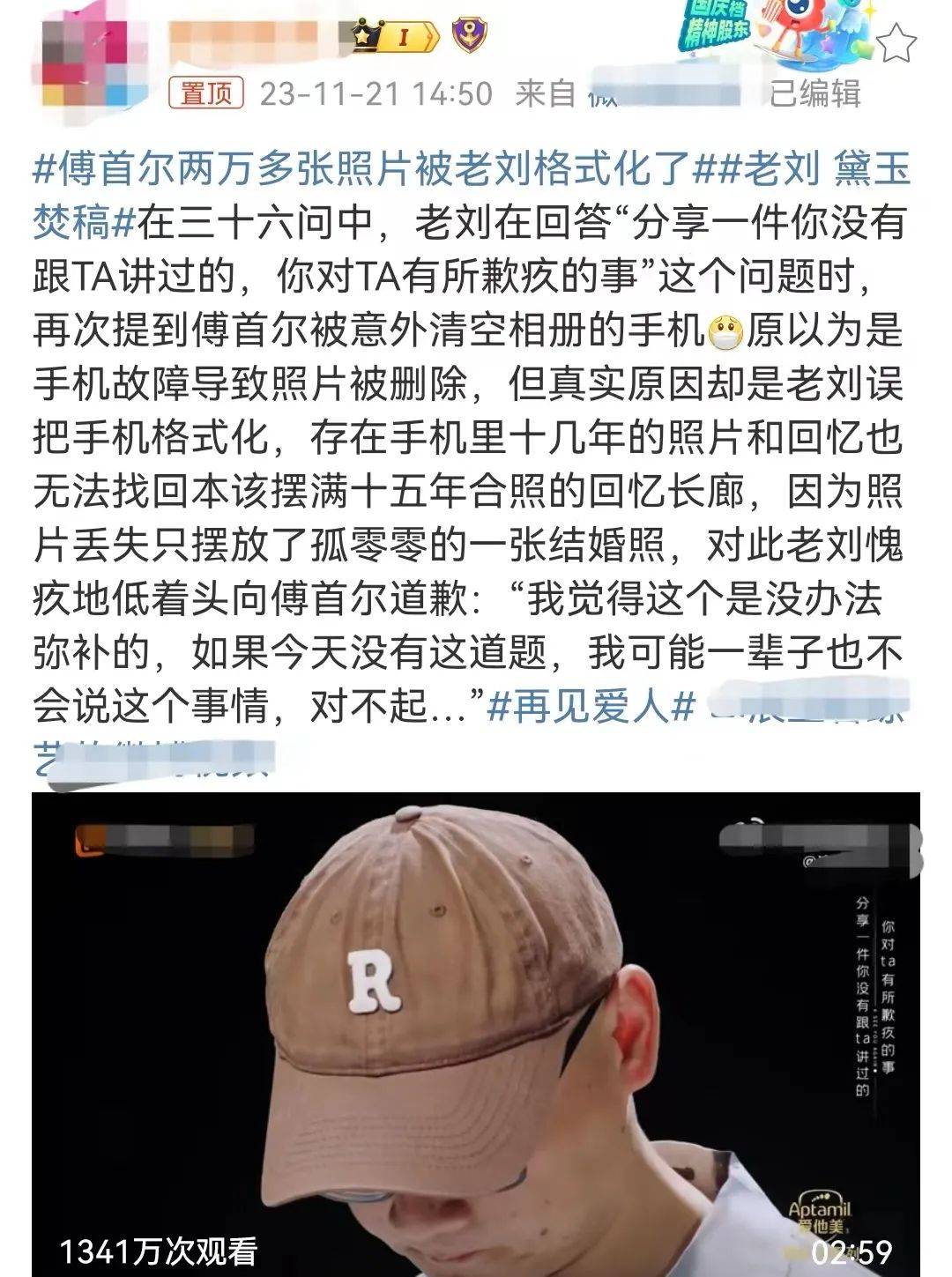 曾经傅首尔手机里有两万多张照片,想要老刘导出来,结果拖延症的他表面答应却没时间做,而他一行动就“坏事”,不小心将象征美好回忆的照片全都格式化了,在节目中他才正式向傅首尔道歉。