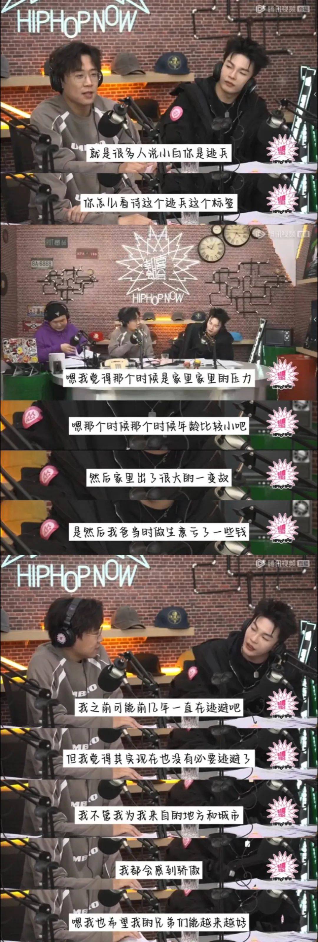 在全网首档可视化电台直播节目《幸会嘻哈》里,BrAnTB白景屹首次回应了贝贝说自己是逃兵的问题。同乡也是老朋友的特邀MC谟西Mercy半开玩笑地感慨,“我俩不常见面,但见面就上热搜。”