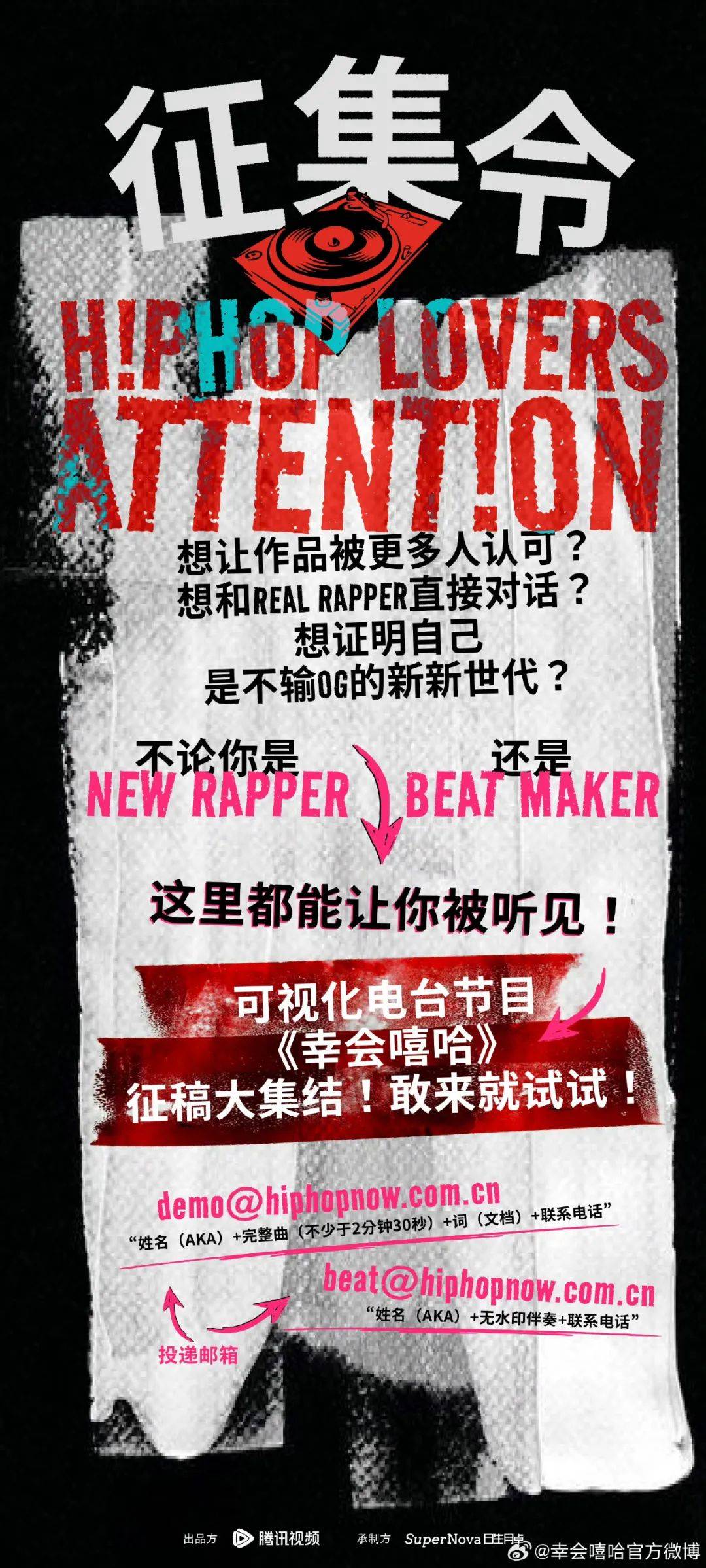值得注意的是不止接受Demo投稿,《幸会嘻哈》也向大众征集Beat(伴奏)用于节目Freestyle环节。“一个面向台前、一个面向幕后,”赵微微希望有更多幕后制作人通过节目推荐也能被听到,“据我了解,有一位作品在网易云累计有近50亿播放量的制作人,找他做歌依然是一两千一首,甚至你要压到800块也可以。”