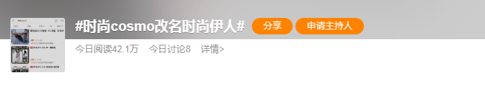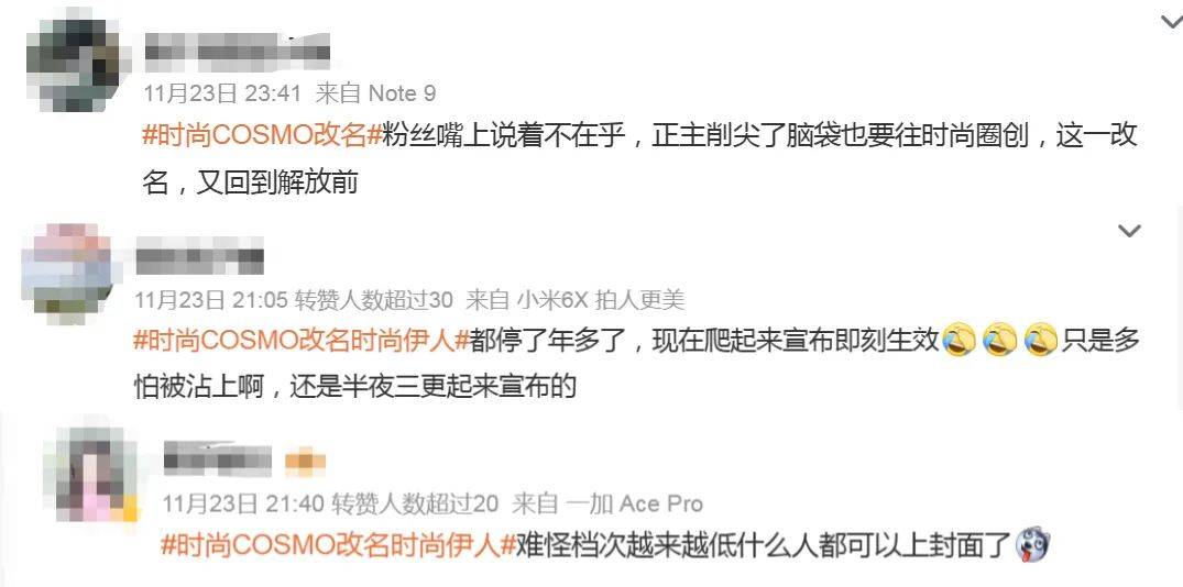 怎么说呢,这件事儿也算是一个时代的结束了。不过虽然《时尚COSMO》这个名字不在了,可《时尚》这本杂志并未停刊,因为从本质上来说《时尚COSMO》从来就不是杂志名称,而是本土杂志(如《时尚》)和国外IP(如COSMO)的版权合作,这本杂志法律意义上还是叫《时尚》,只是从《时尚COSMO》回到最早的马甲《时尚伊人》罢了,