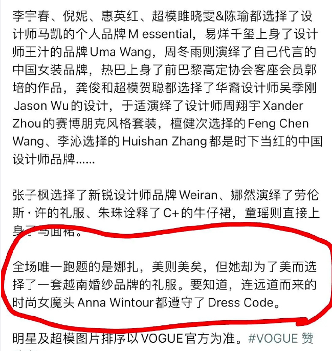 唯一一个跑题的就是娜扎,这位时尚博主说“娜扎美则美矣,但却为了美选择了一套越南婚纱品牌的礼服。要知道,连远道而来的时尚女魔头Anna Wintour都遵守了Dress Code。”