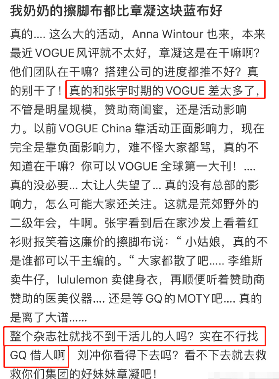 活动办得如此糟糕,每一张官方照片里新主编章凝的存在感却那么强,好多网友都吐槽说,新主编章凝是救过安娜的命吗?这都不开除???