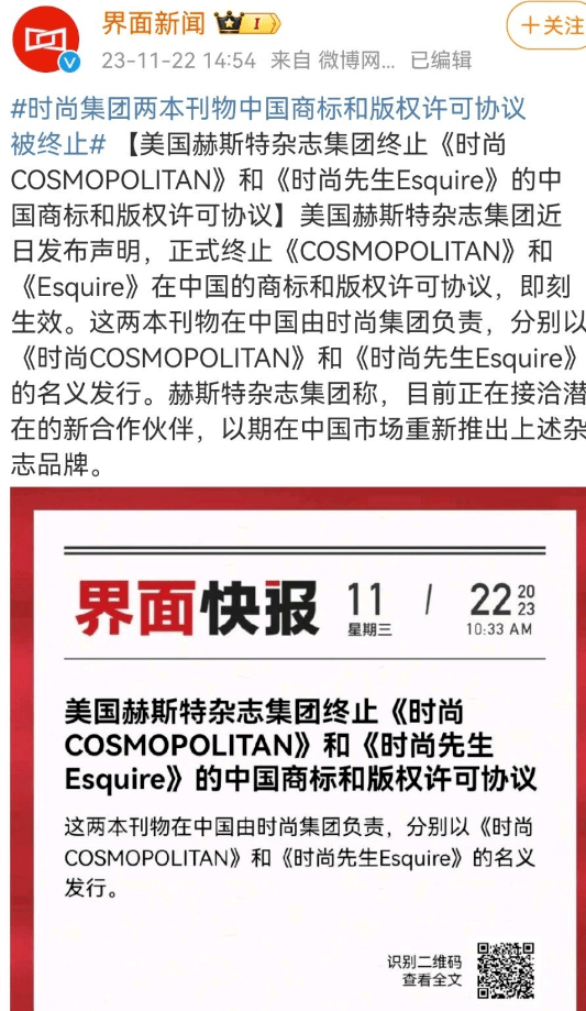 可就在上周,赫斯特集团官宣收回COSMO的版权,《时尚COSMO》和《时尚先生Esquire》这两本杂志将不复存在。