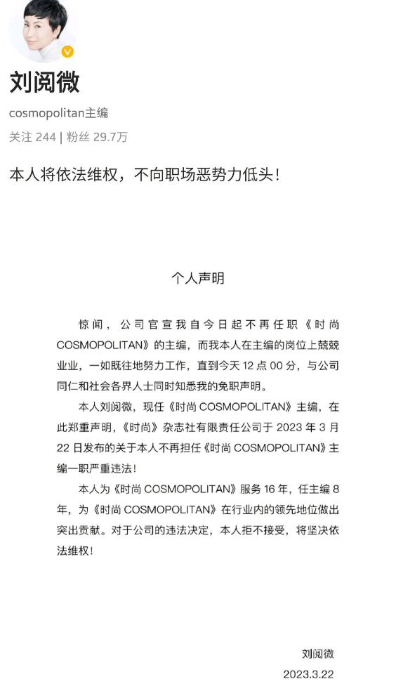 #2018年3月苏芒离职《时尚芭莎》,2019年12月晓雪离职《ELLE》,2021年2月张宇卸任《Vogue》,今年3月《时尚COSMO》官宣主编刘阅微将离任,但刘阅微本人表示是“被动”离任#