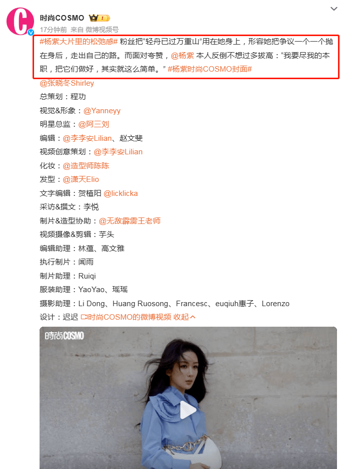 上周五下午,《时尚COSMO》的官博照旧宣传了杨紫的12月刊,带的话题是#杨紫时尚COSMO封面#↓↓