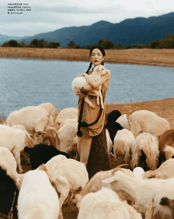 后来,章凝还是选择拿掉了杜鹃的封面。这组拍摄于丽江的照片,最终登上了VOGUE五月号的内页。