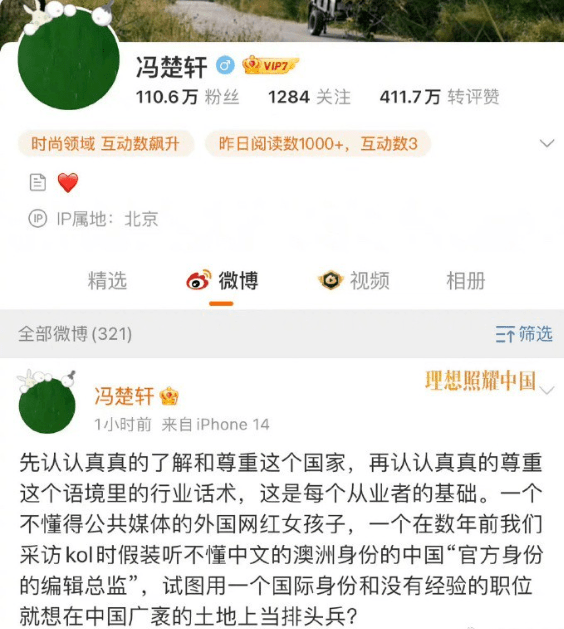 知道这件事的T杂志主编冯楚轩,直接在微博上阴阳怪气的骂她“一个不懂公共媒体的外国网红女孩子,试图用一个国/籍身份和没有经验的职位就想在中国广袤的土地上当排头/兵。”