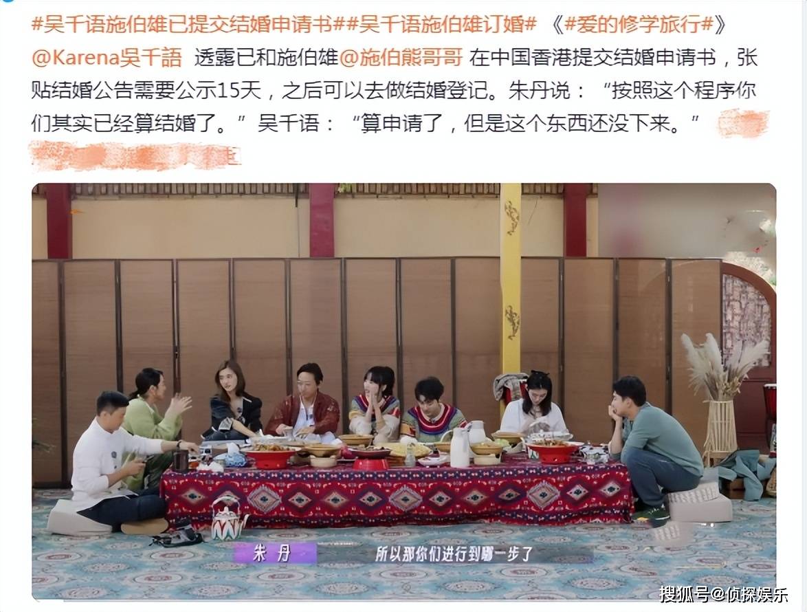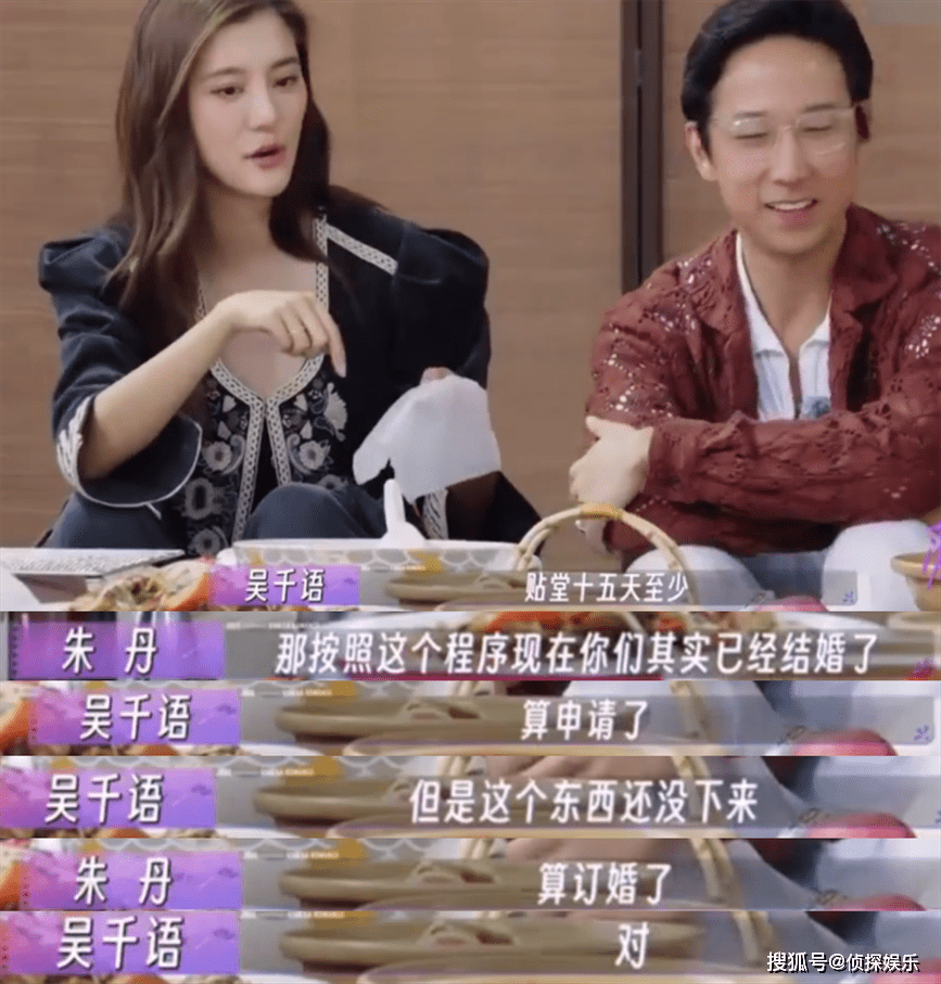最后,朱丹再度询问吴千语,称对方和施伯雄是不是已经算结婚了。吴千语直言两人目前只是算提交结婚申请,但申请还没有下来。随后朱丹又问:“算订婚了”,吴千语则回复:“对”。所以,等到15天公示期结束后,吴千语和施伯雄就会立马登记注册结婚,真是迫不及待地想看到他们的喜讯了。