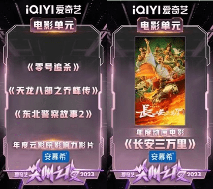 “电影单元”共计颁发10项重磅荣誉,其中,《零号追杀》《天龙八部之乔峰传》《东北警察故事2》获得年度云影院影响力影片;《长安三万里》获得年度动画电影;金晨获得年度突破演员;文咏珊、王传君获得年度女配角、男配角;倪妮、王一博获得年度女主角、男主角;久美成列、孔大山、徐昂获得年度青年导演;大鹏获得年度导演;《封神第一部:朝歌风云》获得年度影片;年度特别关注影片则包括《热搜》《瞒天过海》《怒潮》《临时劫案》《非诚勿扰3》5部作品。
