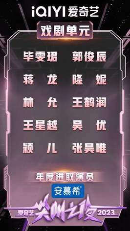 高品质的内容也离不开演员的精彩表现与艺术家的潜心创作。毕雯珺、郭俊辰、蒋龙、隆妮、林允、王鹤润、王星越、吴优、颖儿、张昊唯获得年度进取演员;田曦薇、张凌赫分别获得青春飞跃女演员、男演员;李一桐、曾舜晞分别获得年度突破女演员、男演员;宋轶、魏大勋分别获得年度青年女演员、男演员;秦岚、王阳分别获得年度魅力女演员、男演员;马伯庸获得年度作家;高璇、任宝茹获得年度编剧;谭松韵、白敬亭分别获得观众喜爱的女演员、男演员;虞书欣、成毅分别获得年度影响力女演员、男演员;高叶、林永健分别获得年度女配角、男配角;闫妮、张若昀分别获得年度女演员、男演员;郝蕾、陈晓分别获得年度品质女演员、男演员;徐纪周获得年度导演。此外,现象级爆款《狂飙》荣获年度剧王。