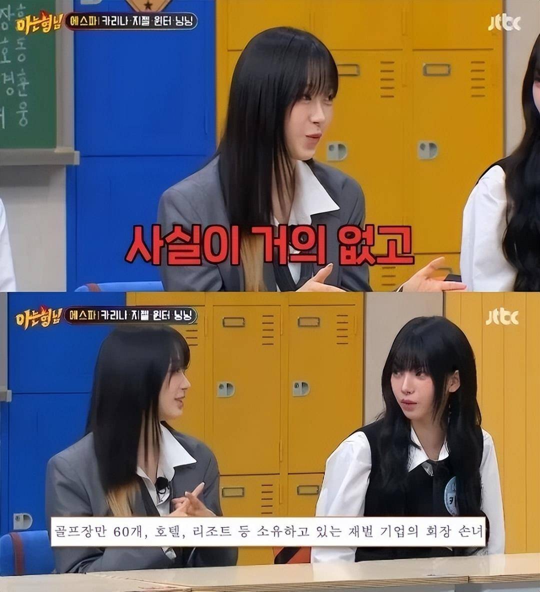 当天的节目中,aespa成员们提到了围绕吉赛尔的传闻,“你是大企业的孙女吗?” ,这个问题是《认识的哥哥》成员向吉赛尔提出的。