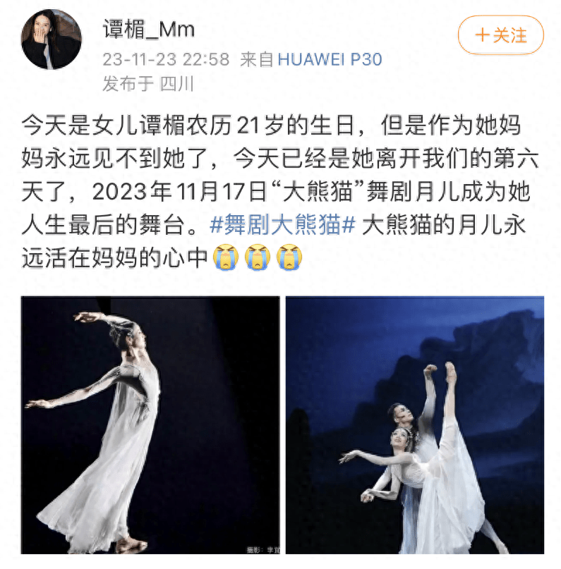 母亲悲痛发文:“今天是女儿谭楣农历21岁的生日,但是作为妈妈永远见不到她了,今天已经是她离开我们的第六天了,2023年11月17日“大熊猫”舞剧月儿成为她人生最后的舞台,大熊猫的月儿永远活在妈妈的心中。”
