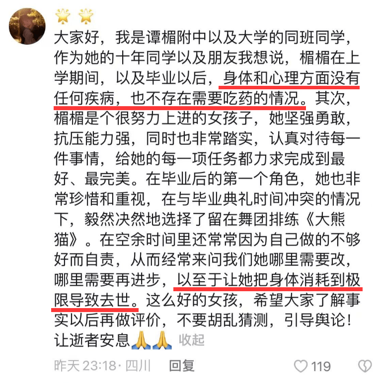 另一同学也发言,说谭楣在排练《大熊猫》舞剧以来,一直处于一个紧绷的状态,面对团里和各种因素一直都以正面态度去对待,不断的练习,以至于消耗自己的身体导致现在的结果。