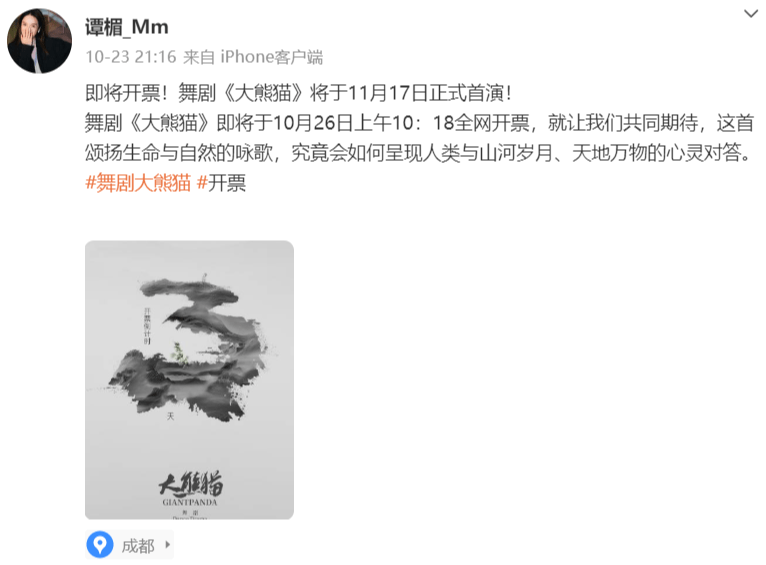 翻看谭楣的社交账号,她在10月23日还发布动态为《大熊猫》宣传,然而却在《大熊猫》首演当日出了意外,真就太突然了。