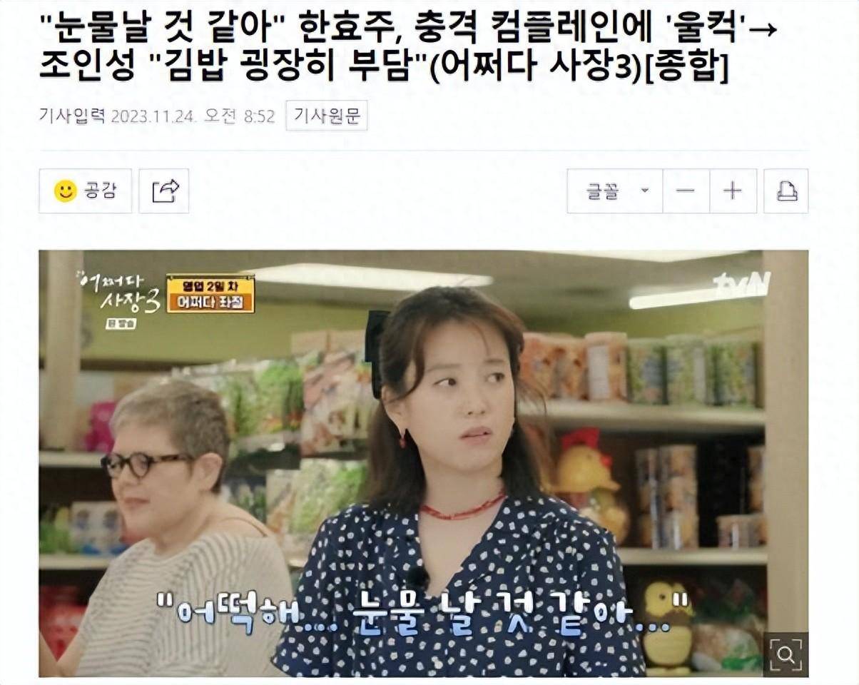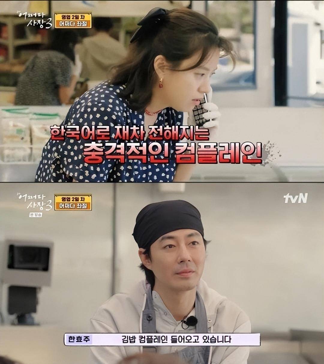 韩国明星,女演员韩孝周,因为不断传来的紫菜包饭投诉而落泪,赵寅成还向顾客表达了对前任店主招牌紫菜包饭的质量和数量的担忧,表示我们是新手,所以真的很难。