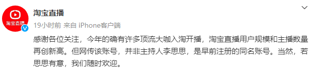随后,也有她要带货的消息传出,对此,淘宝官方也发文回应,否认李思思将要以私人的名义带货。